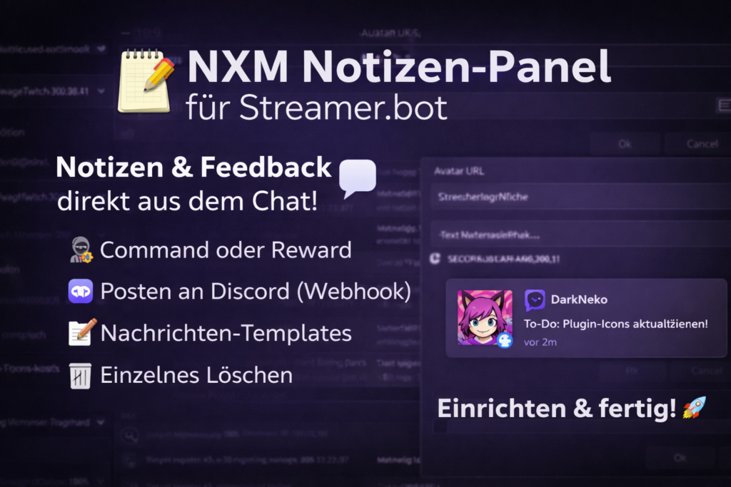 Mit dem NXM Notizen-Panel können Zuschauer per Command oder Channel-Reward Notizen erstellen, die automatisch an Discord gepostet und lokal gespeichert werden.